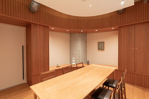西麻布に位置するアートをテーマにした会員制ダイニングの内装計画。内部は4つの部屋で構成され、それぞれ国内外のギャラリーがアート作品を展示し、 内装や家具も各ギャラリーの個性を反映した設えとしている。全室に共通して用いられた曲面壁の中間部に設けられた飾り棚を、部屋と外界をつなぐ「出窓」に見立て、アートに囲まれた環境の中で、落ち着いて食事と対話を楽しめる空間を創出した。