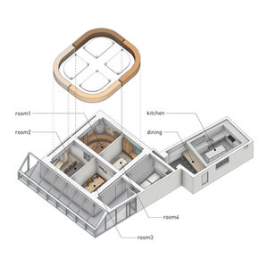 An interior design plan for a members-only dining space in Nishi-Azabu, themed around art. The space is composed of four rooms, each curated by domestic and international galleries that present artworks, while the interiors and furnishings are designed to reflect the unique character of each gallery. A unifying element across all rooms is the curved wall, within which recessed display shelves are installed. These shelves are conceived as “bay windows,” connecting each room to the outside world through the exhibited works. In this way, the project aims to create an environment surrounded by art, where guests can enjoy both dining and conversation in a calm and intimate setting.